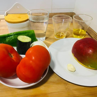 Con el calor apetecen las ensaladas y los gazpachos. En esta ocasión os traigo este gazpacho con mango, había oído hablar mucho de él y aprovechando que tenía un mango casi entero me he decidido. La verdad es que el sabor es muy parecido a mi gazpacho habitual pero con el toque dulzón del mango que queda bastante agradable.